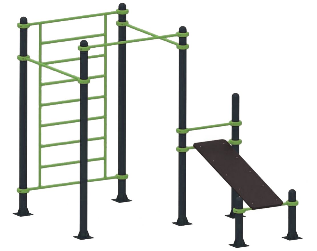 Спортивный комплекс на хомутах, в состав входят: шведская стенка, три турника и скамья для пресса.