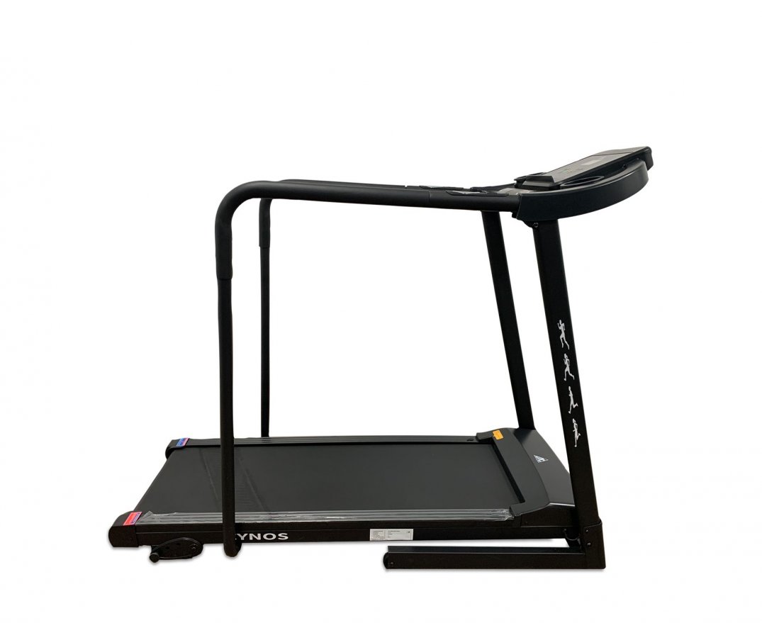 CYNOS — электрическая беговая дорожка чёрного цвета для домашнего применения и использования в спортивных и реабилитационных целях. Модель отличается присутствием в комплектации специальных удлинённых поручней для реабилитационных занятий, возможностью регулировки наклона бегового полотна в трёх положениях.