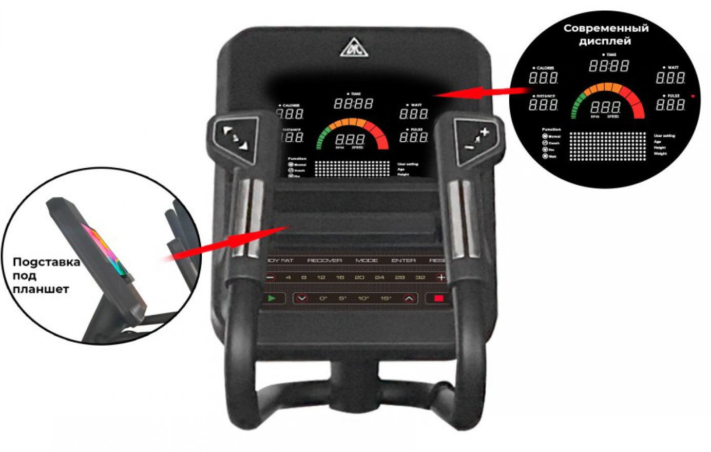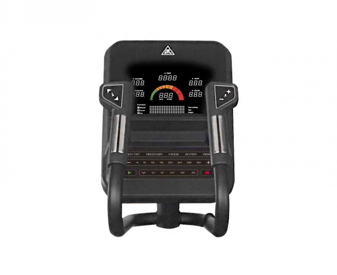 Имеется 12 предустановленных программ для тренировок. Уникальный цветной дисплей — такой практически не встретить среди других аналогов. На нём отображаются: время занятия, скорость, уровень сложности, расстояние, затраченные калории, пульс, который считывается с датчиков на поручнях. Имеются MP3 и USB входы на передней консоли, а также подставки под планшет и бутылку.