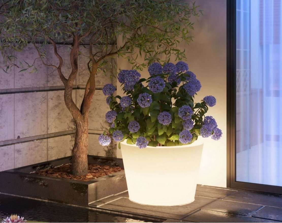 Кашпо с подсветкой может использоваться в любых условиях: на улице и внутри помещений, в жару и в мороз, в сухую погоду и при осадках. Корпус изделия, выполненный из полиэтилена низкого давления, соответствует стандарту защиты IP 65 и защищает светодиодный элемент от контакта с водой и пылью.