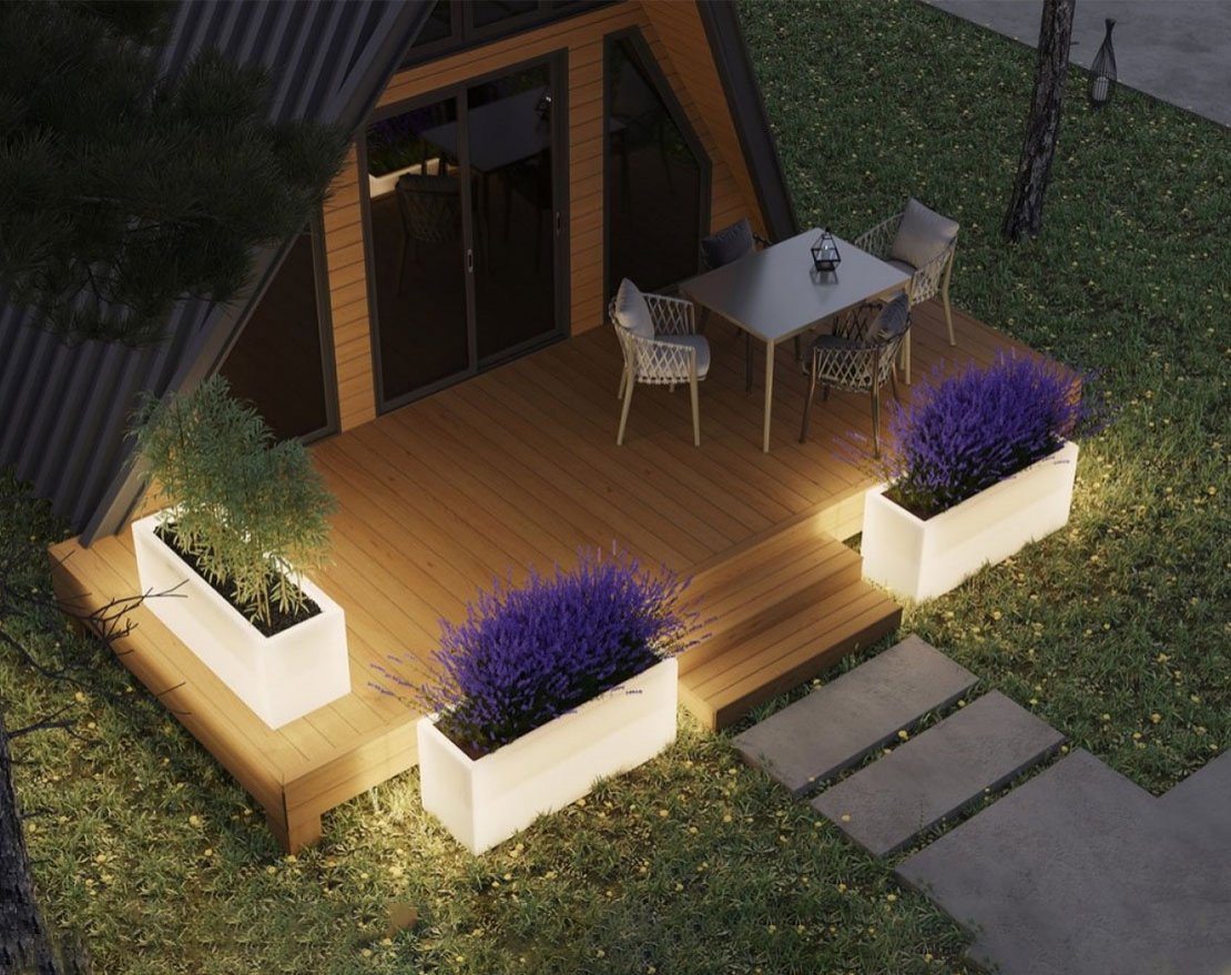 В кашпо Horizont с подсветкой можно выращивать цветы, кустарники и небольшие деревья. Изделие очень прочное – оно изготовлено из полиэтилена низкого давления и может выдерживать высокие нагрузки от грунта и корней. Земля засыпается прямо внутрь кашпо. При необходимости водоотведения изделие может быть дополнительно оснащено дренажной системой.
